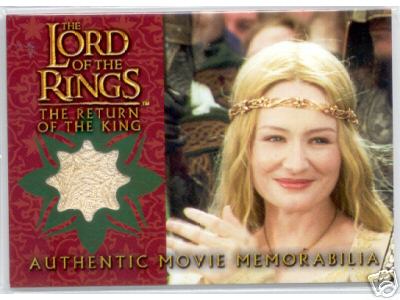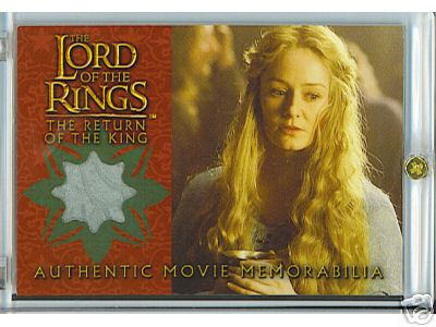 This costume card holds an authentic costume swatch from Éowyn's coronation gown. It was only available as a special insert in the Topps ROTK update cards boxes. You can still find this card at many comic/sci-fi conventions and on Ebay. |